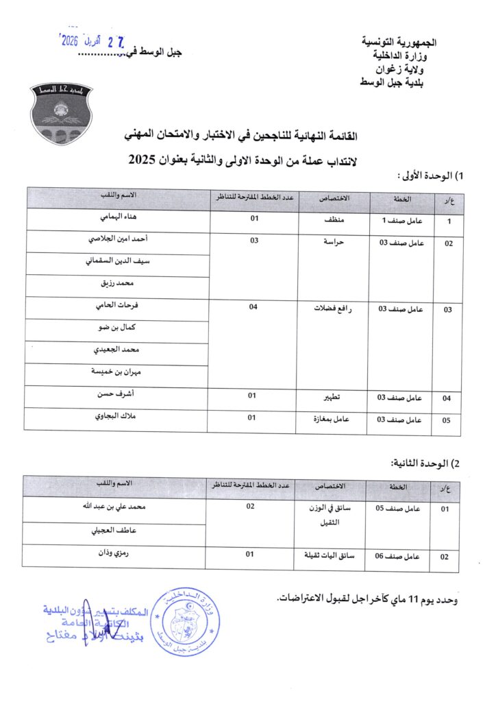 القائمة النهائية للناجحين في الاختبار والامتحان المهني لانتداب عملة من الوحدة الاولى والثانية بعنوان سنة 2025